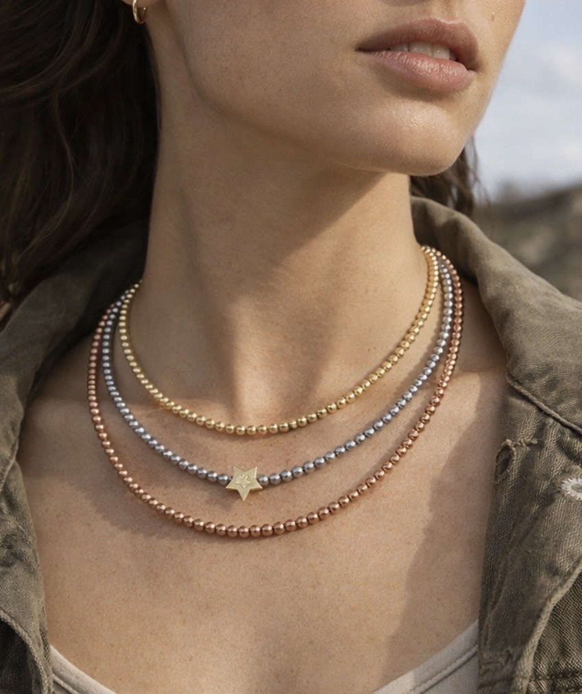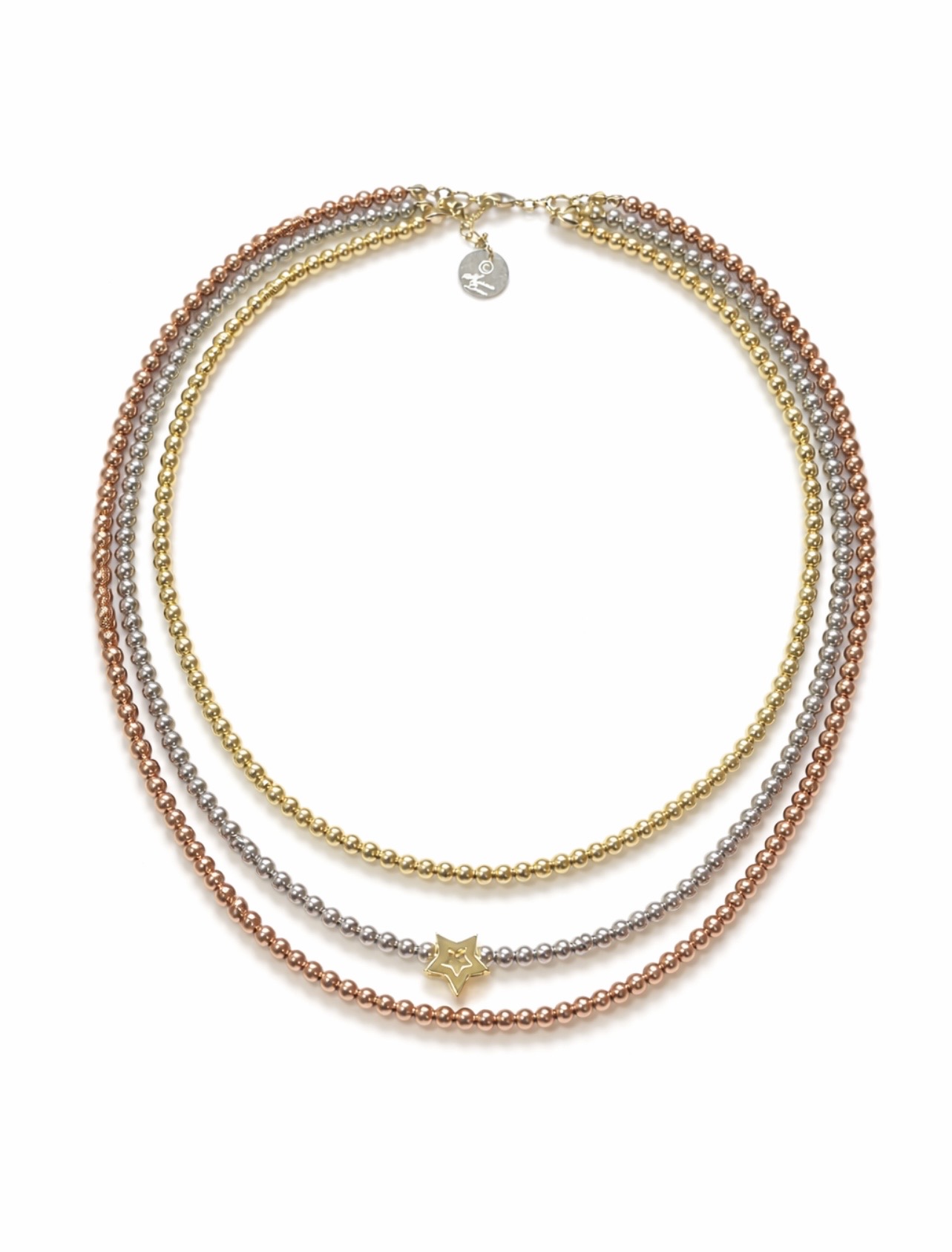 Collar en layering, elaborado con balines bañados en oro 18k, plata 925 y oro rosado.
