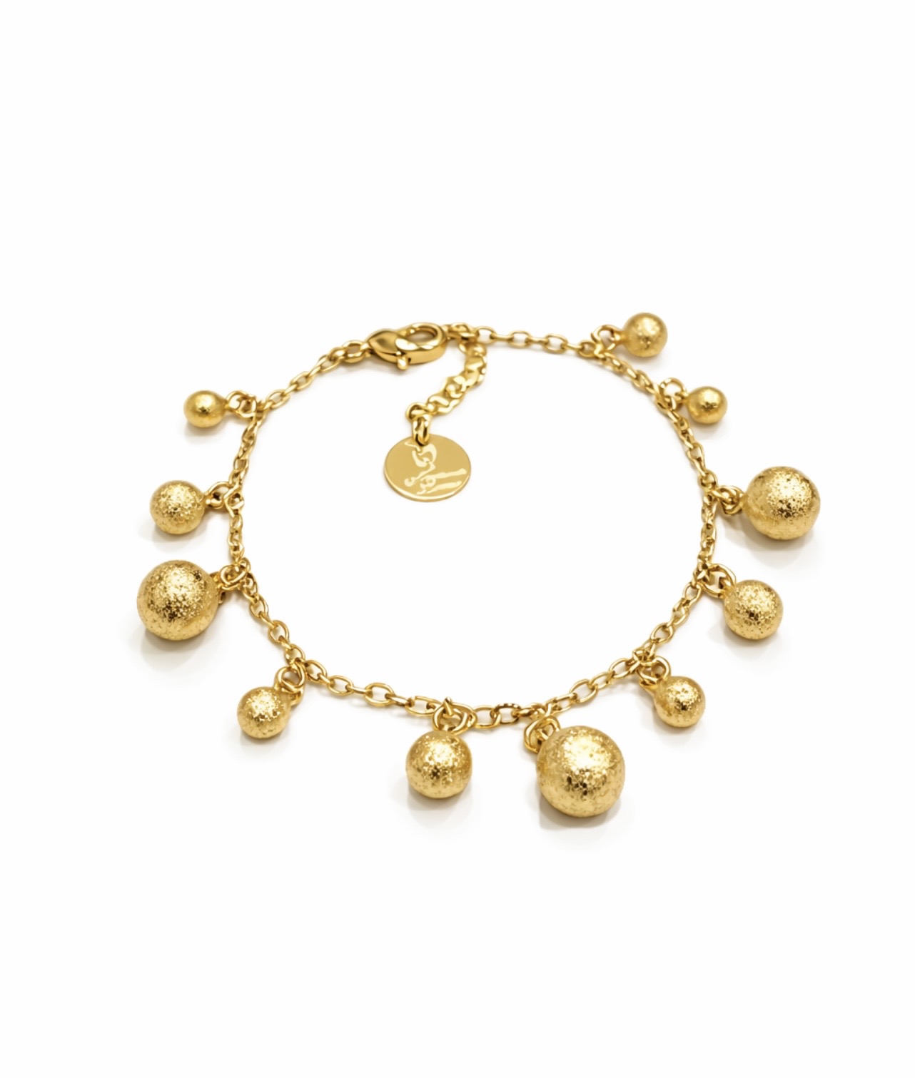 Collar elaborado en cadena de finos eslabones bañada en oro y balines macizos de bronce bañados en oro texturizado.