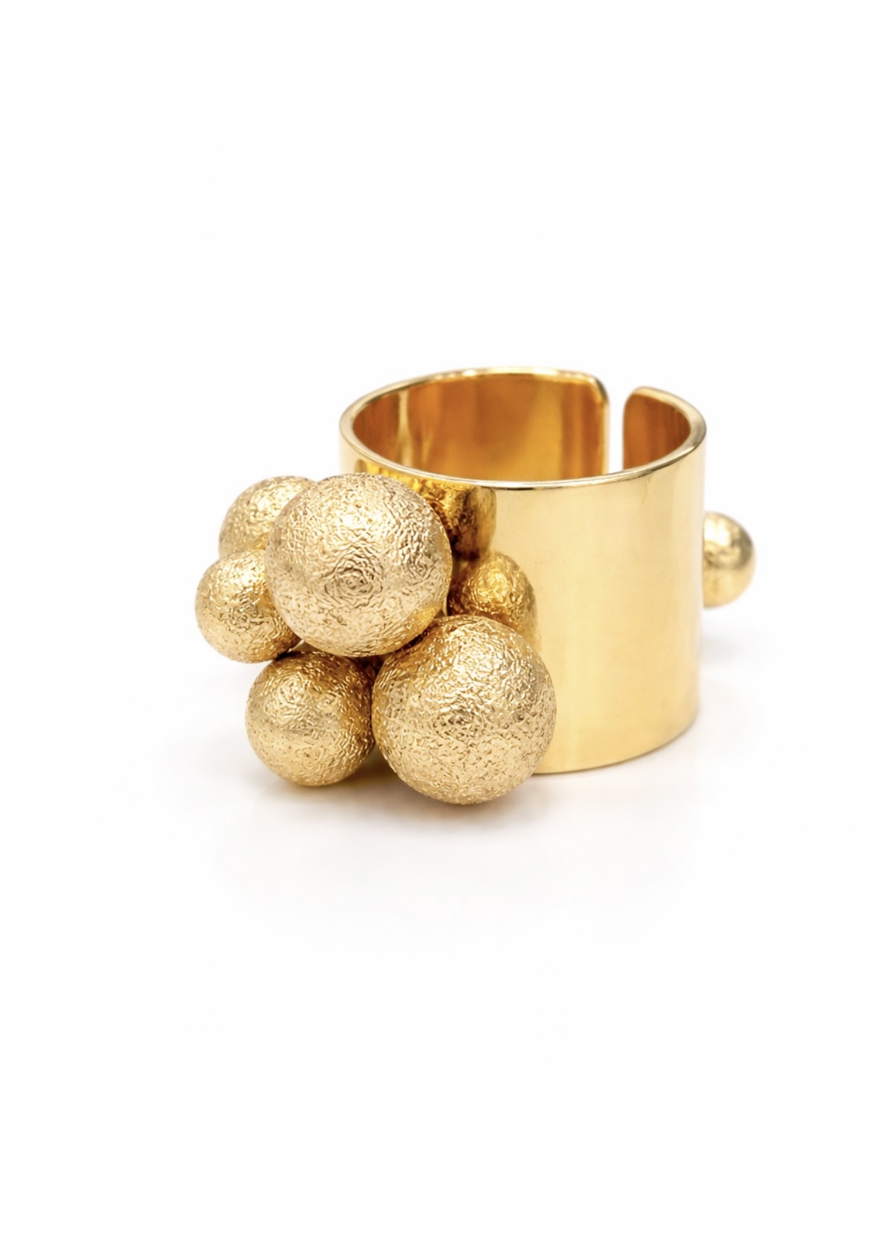 Anillo ajustable, elaborado en bronce bañado en oro, con balines de bronce macizos bañado en oro texturizado