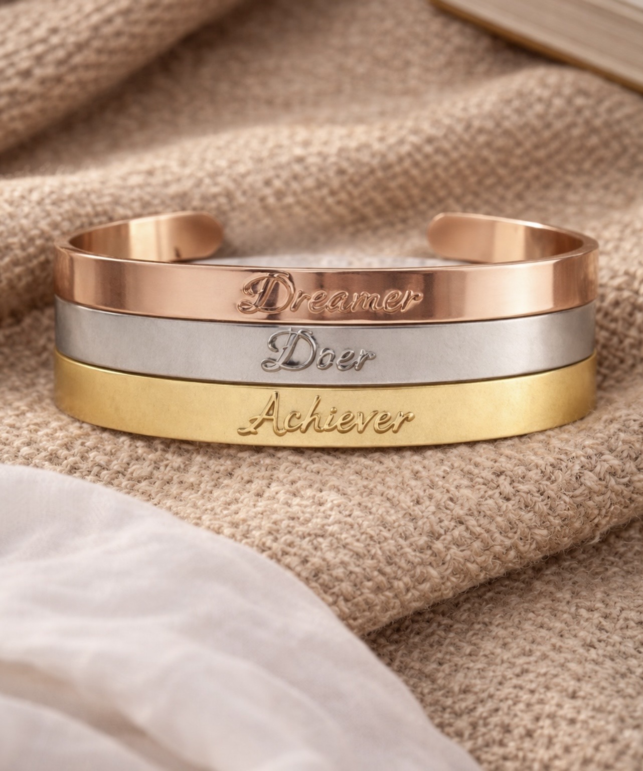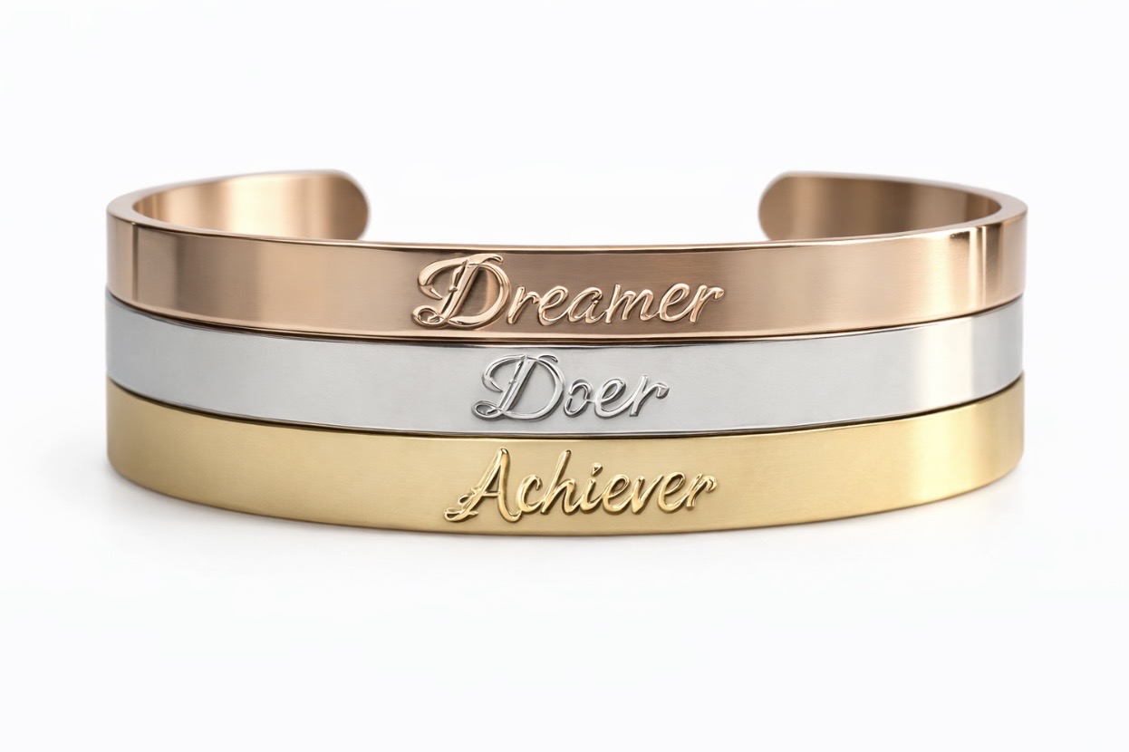 Juego de 3 brazaletes de acero bañados en oro, grabados con las palabras Dreamer, Doer y Achiever, bañados en oro amarillo y oro rosado.